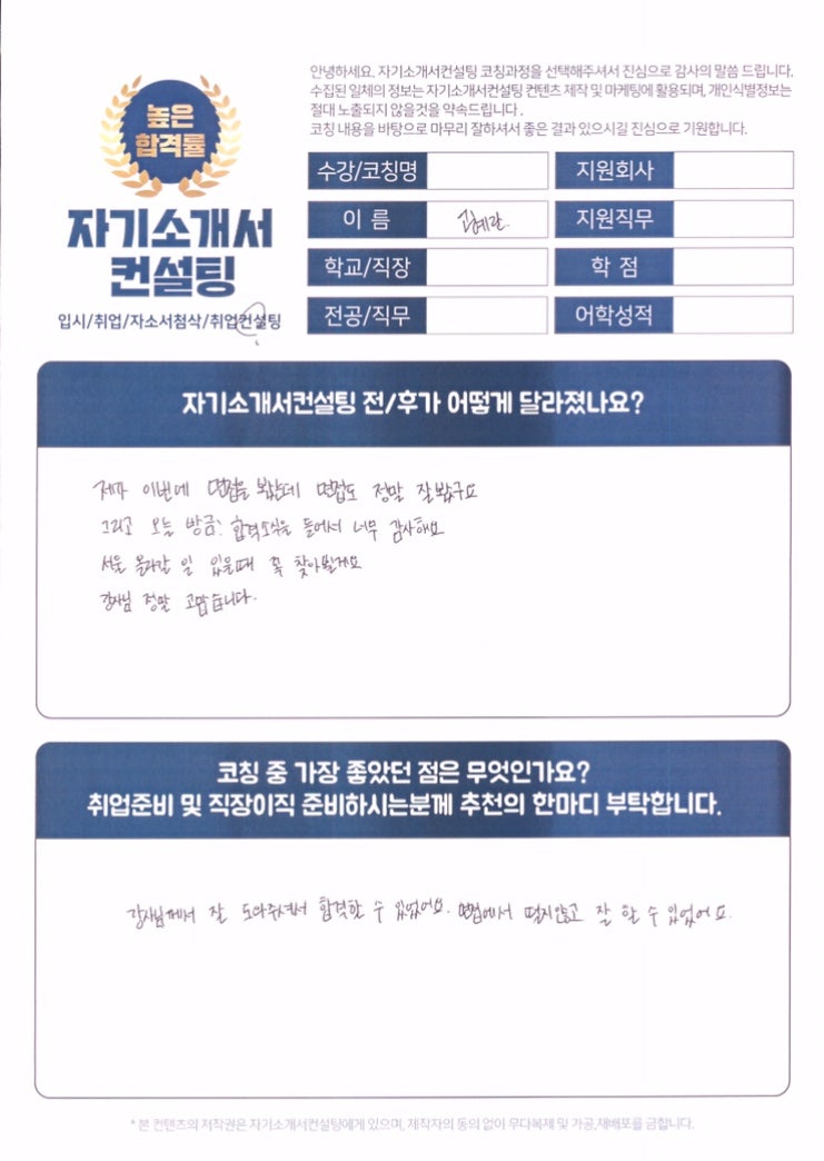 안녕하세요! 📝 매년 2,000명이 넘는 지원자분들과 만나며 대기업, 공기업, 공무원 등 수많은 합격의 순간들을 함께하고 있는 자기소개서 전문가입니다. 저의 오랜 경험과 노하우를 바탕으로 1. 취업 자기소개서 첨삭 및 대행 2. 학업계획서 3. 경력기술서 및 직무수행계획서 진행 4. 면접컨설팅까지 꼼꼼하게 도와드리고 있어요! 특히 채용공고 분석부터 자소서 항목 및 문항 분석, 그리고 합격하는 자기소개서 작성하는 방법까지 아낌없이 공유드리고 있답니다. 오늘도 짜릿한 합격 후기를 들려드릴게요! 💖