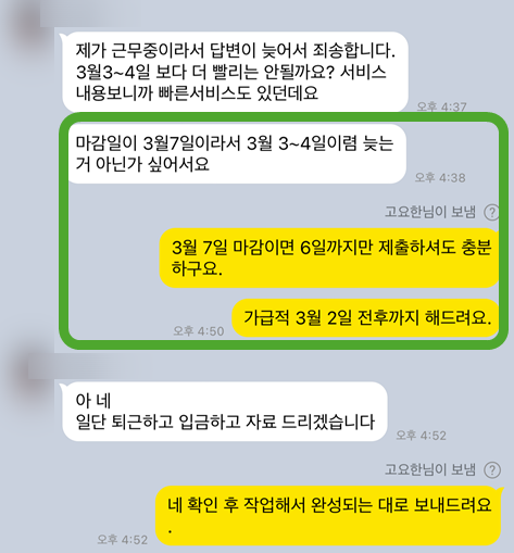>> 2단계: 자료 공유 (지원하실 기업명, 직무, 마감 기한, 초안 자소서, 이력서 등 관련 자료를 보내주세요.)