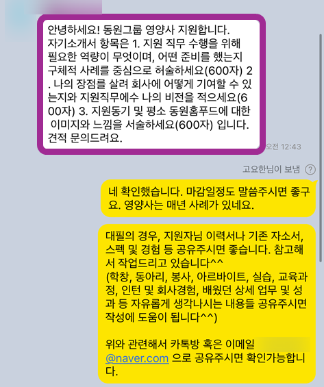 #자기소개서 #자소서 #자기소개서대필 #자소서대필 #자기소개서첨삭 #자소서첨삭 #취업컨설팅 #취업준비 #합격자소서 #대기업자소서 #신입자소서 #동원그룹 #동원그룹자소서 #동원그룹채용 #생산직자소서 #자기소개서전문가 #취업성공 #서류합격 #첨삭전문가 #자기소개서의뢰 #취업고민 #채용직무정보#생산직자소서#채용공고#자소서예시#자소서대행#자기소개서대행#자소서항목#자기소개서문항#합격후기#이력서#경력기술서#직무수행계획서#연봉#자소서쓰는법#자기소개서쓰는법