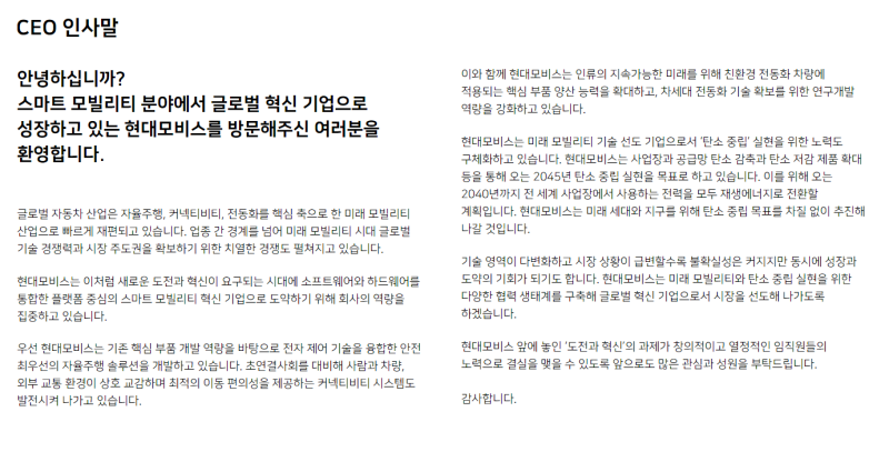비전: ‘Beyond Mobility, For a Better Future’를 지향하며, 미래 모빌리티 솔루션 제공을 통해 인류의 삶을 더 나은 방향으로 이끌고자 합니다.